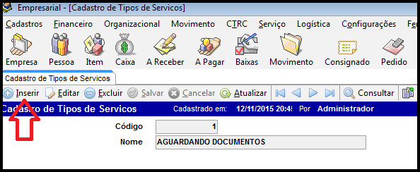 Para cadastrar Tipo clique no ícone inserir, preencha nome conforme a necessidade, clique em salvar e pronto, cadastro efetuado. Conforme imagem abaixo.