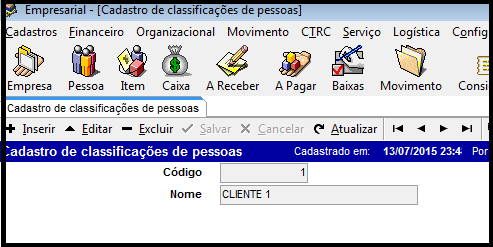 Para realizar cadastro de Tipo Logística clique em inserir descreva no campo nome conforme sua necessidade para consulta posterior, que sera vinculado ao cadastro do cliente. Observação: Serve para classificar e consulta de relatórios.