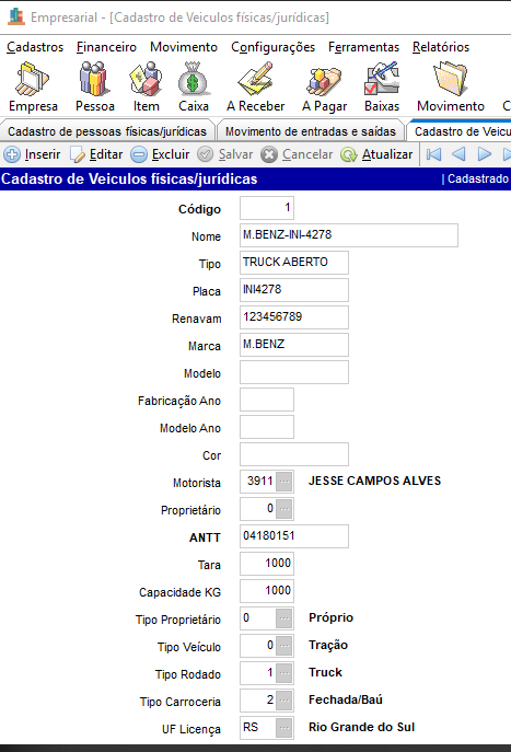 preencha com os dados: Código, Nome, Tipo, Placa, Renavam, Marca, Modelo, Fabricação Ano, Modelo Ano, Cor, Motorista, Proprietário, ANTT, Tara, Capacidade KG, Tipo de Proprietário, Tipo de Veículo, Tipo de Rodado, Tipo de Carroceria, UF Licença. Clique em